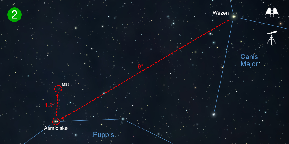 Find moderately bright Asmidiske (+3.32) in Puppies, about 7° east of Wezen. It is a double-star and is visible naked-eye in most skies. Using binoculars or a telescope finder, point to and center it.Slowly scan northwest just 1.5°. M93 will appear as a hazy patch, slightly elongated, distinct from the pinpoint stars nearby.