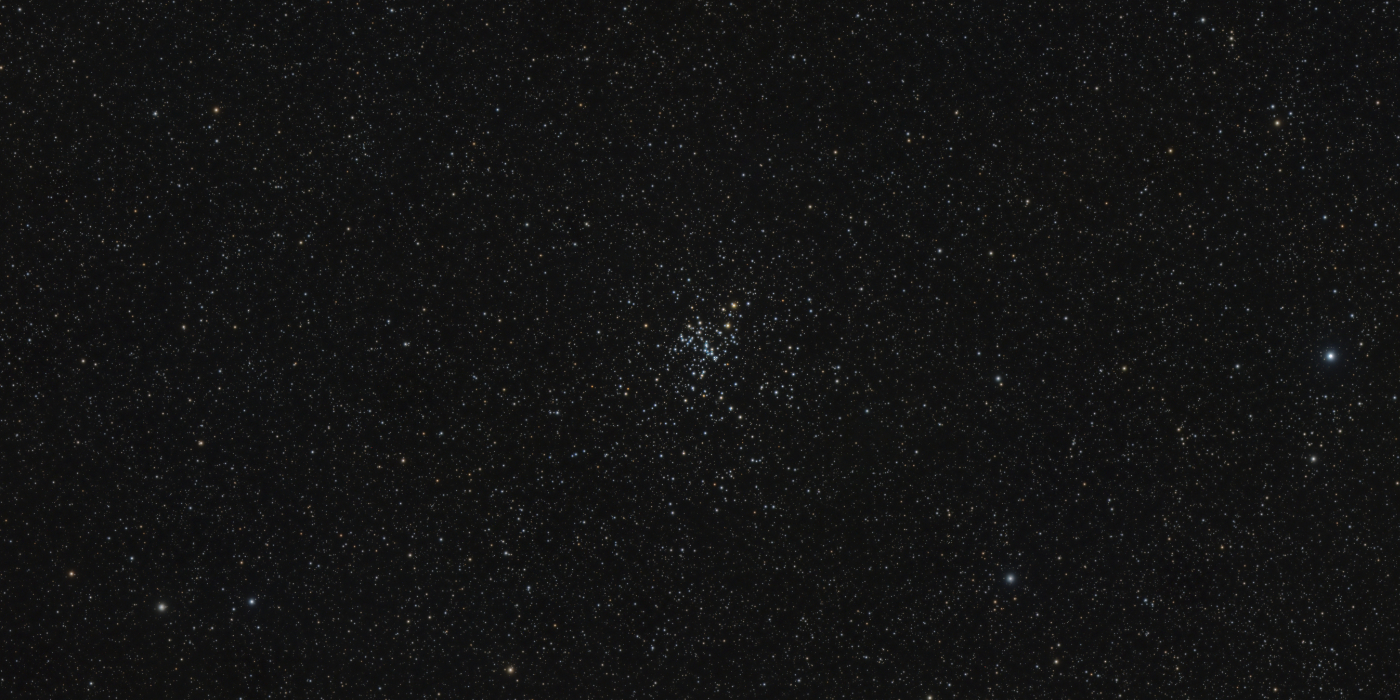 Messier 93 is a sparkling open cluster in the constellation Puppis. Discovered by Charles Messier in 1781, this cluster lies about 3,600 light-years away and contains more than 80 stars spread across an area roughly the size of the full Moon. Using a telescope, it appears as a loose, bright grouping of stars, some of them forming curved chains that give it a graceful, floral shape.