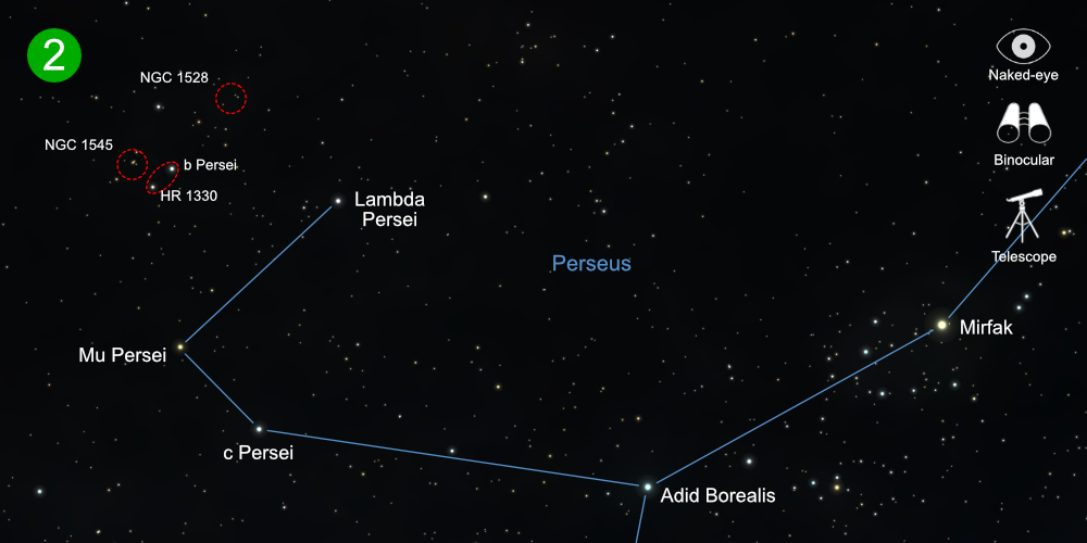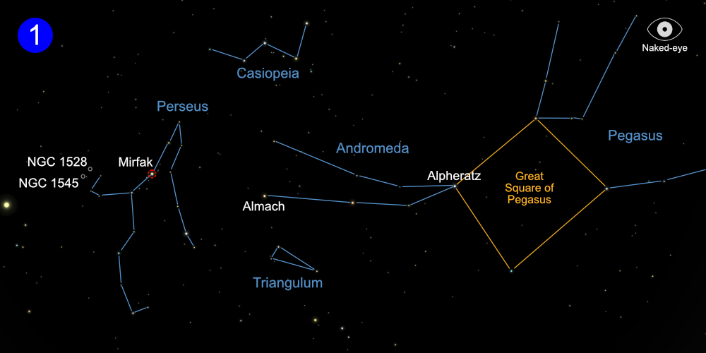 The best way to star hop to NGC 1528 and NGC 1545 is to begin with the bright constellation of Perseus, which is high in the northern sky during autumn and winter evenings and can be found near Cassiopeia and Andromeda. Start by locating the bright star Mirfak (+1.80), the central star of Perseus, which shines prominently within the loose “Alpha Persei Cluster.”
