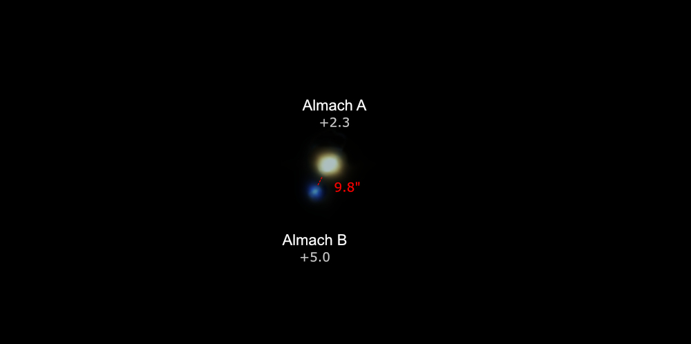 The brighter component, Almach A, gleams with a warm golden hue and shines at about magnitude +2.3. Its companion, Almach B, lies 9.8 arcseconds away and glows a cool sapphire blue, around magnitude +5.0 — just enough dimmer to highlight the contrast beautifully. In fact, Almach B is not a single star at all but a multiple system of its own, with inner companions revealed only by large telescopes and spectroscopy. Altogether, Almach is a true multiple star system, but its visual double is what captivates observers most.
