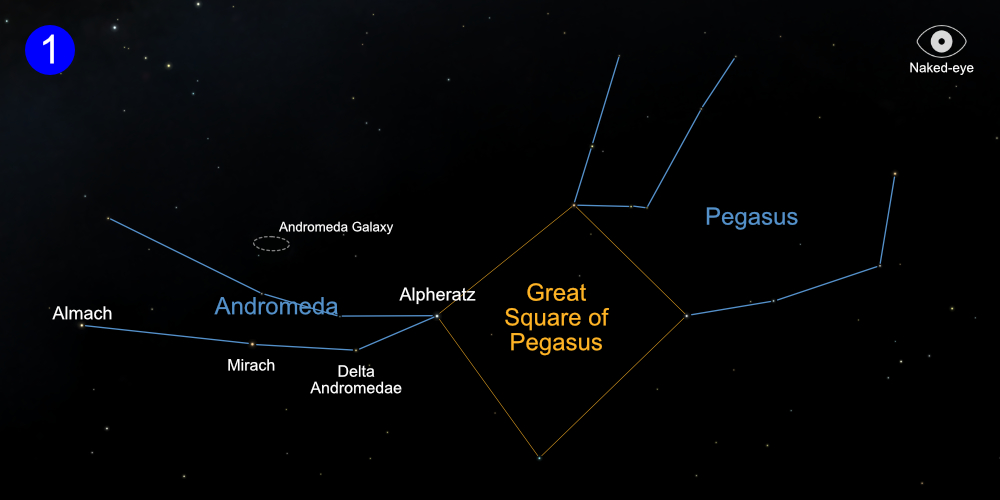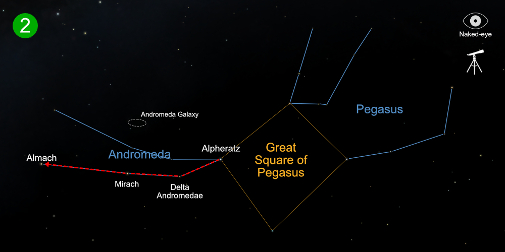 The best way to find Almach (Gamma Andromedae) is to begin with the unmistakable Great Square of Pegasus, the large diamond-shaped asterism that dominates the autumn sky.