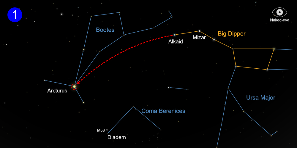 From the end stars of the handle of the Big Dipper, Alkaid (+1.86) and Mizer (+2.22), hop to very bright Arcturus (+0.15) in Bootes.