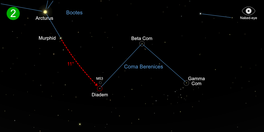 Hop from Arcturus to Murphid (+2.68) and continue in the same direction another 11° to dim Diadem (+4.32) in Coma Berenices. Confirm this by finding the other two main stars of Coma Berenices, Beta Com (+4.25) and Gamma Com (+4.34).