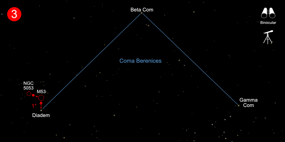 ✅ Use Diadem as Your Starting Point Messier 53 is easy to locate by starting with Diadem (Alpha Comae Berenices), the brightest star in Coma Berenices. M53 sits just about a degree northeast of this star, making it a simple hop for binoculars or a telescope.