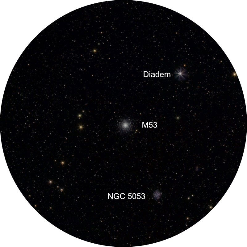 Using binoculars or a telescope finder, point to Diadem. Once you’ve centered on Diadem, shift your binoculars or telescope just a little more than one degree to the northeast. At this position, Messier 53 will appear as a faint, fuzzy patch of light in binoculars or a bright, compact glow in a telescope. Its close proximity to Diadem makes it one of the simplest Messier globulars to track down, requiring only a short hop.