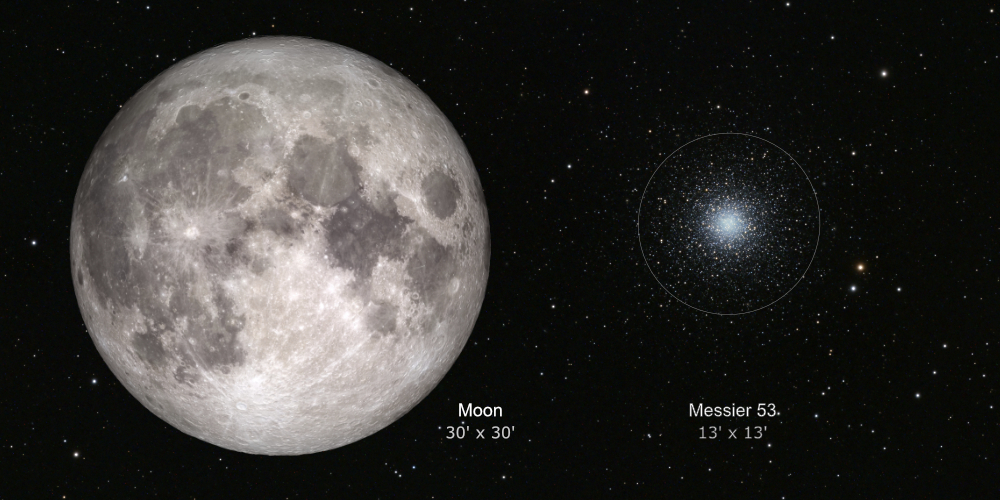 To the naked eye, Messier 53 is invisible. Even under very dark skies, its great distance, compact size and dimness make it too difficult to see to the naked eye.