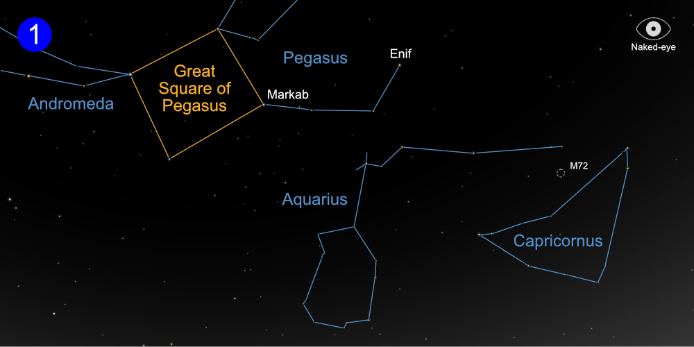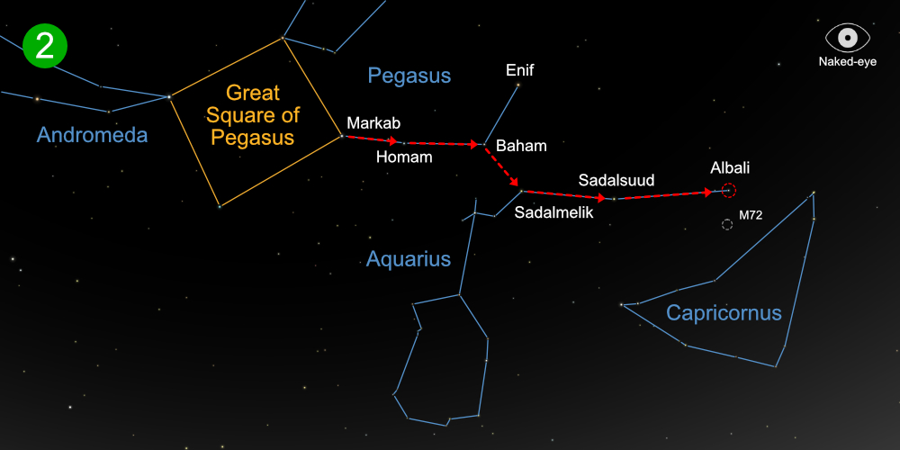 ✅ Use Aquarius as Your Starting Point Messier 72 sits in the faint constellation of Aquarius, so begin by locating its brighter stars like Sadalsuud and Sadalmelik. From there, work your way southward toward the region that also holds the Saturn Nebula and M73.