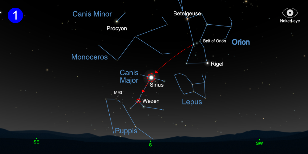 Find Sirius (-1.44) in the southern sky. It shines brilliantly—far brighter than any other star—and marks the heart of Canis Major. To confirm, note that the Belt of Orion points downwards to Sirius. From there, hop 11° south to Wezen.