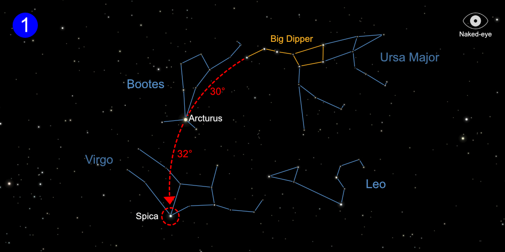 Find the bright star Spica (+1.05). To find it, hop from the end star of the Big Dipper, to bright Arcturus (+0.15), and then to Spica.