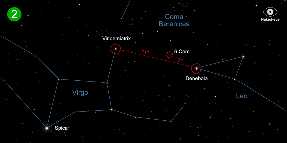 Find bright Vindemiatrix (+2.83) in Virgo and Denebola (+2.13) in Leo. Now for the more challenging step: using a telescope finder or very low-powered eyepiece, hop to 6 Com (+5.09). Although too dim for naked-eye viewing under most skies, 6 Com is typically bright in finders and low-powered eyepieces. One way to find it is to first find Denebola and then slowly scan about 7° toward Vindemiatrix.
