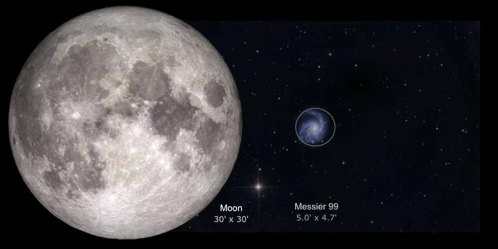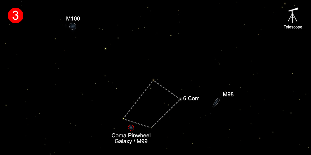 Bonus Targets: look 0.5° west of 6 Com for M98, a spiral galaxy. Look 2° northeast of 6 Com for M100, another spiral galaxy. M98, in contrast to M99, is edge-on — long and spindle-shaped, with a brighter central bulge tapering to pointed ends. M100 appears more classic and face-on, with a smooth round disk and a well-defined central glow.