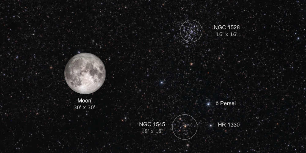 They are not too hard to find, especially NGC 1528, and well worth lingering over on a crisp autumn or winter night. In short: NGC 1528 and 1545 are a “two-for-one starry treat” in Perseus.