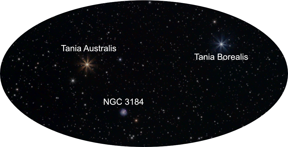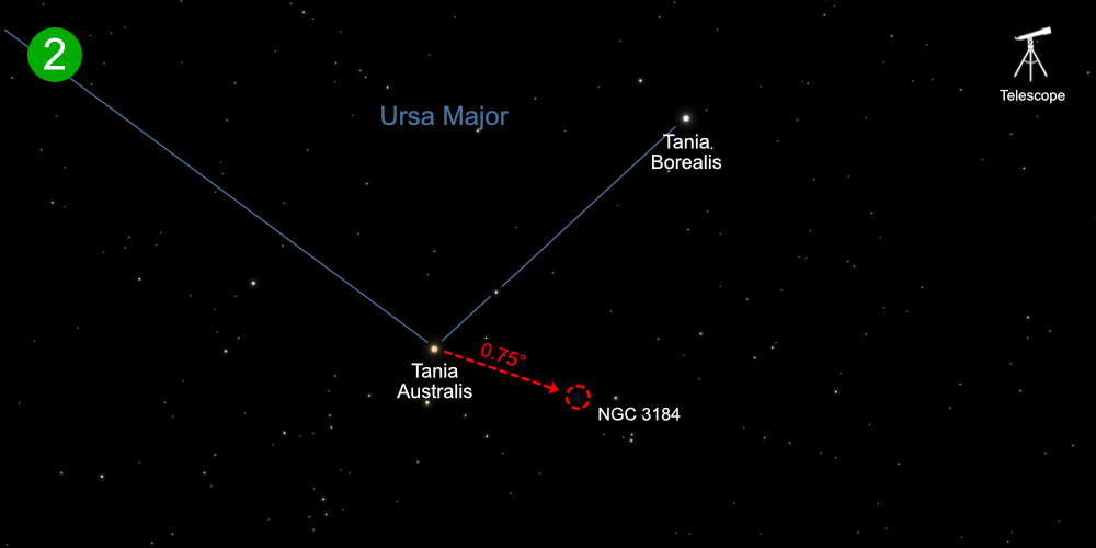 The best way to star hop to NGC 3184 is to use the Big Dipper as your guide, since the galaxy lies in Ursa Major not far from this familiar landmark. Begin with the two stars that form the bottom of the Dipper’s bowl. These bright stars are easy to spot and make an excellent anchor for your hop. Now find the two stars Tania Australis (+3.04) and Tania Borealis (+3.44) which form the foot of one of the hind legs.